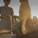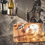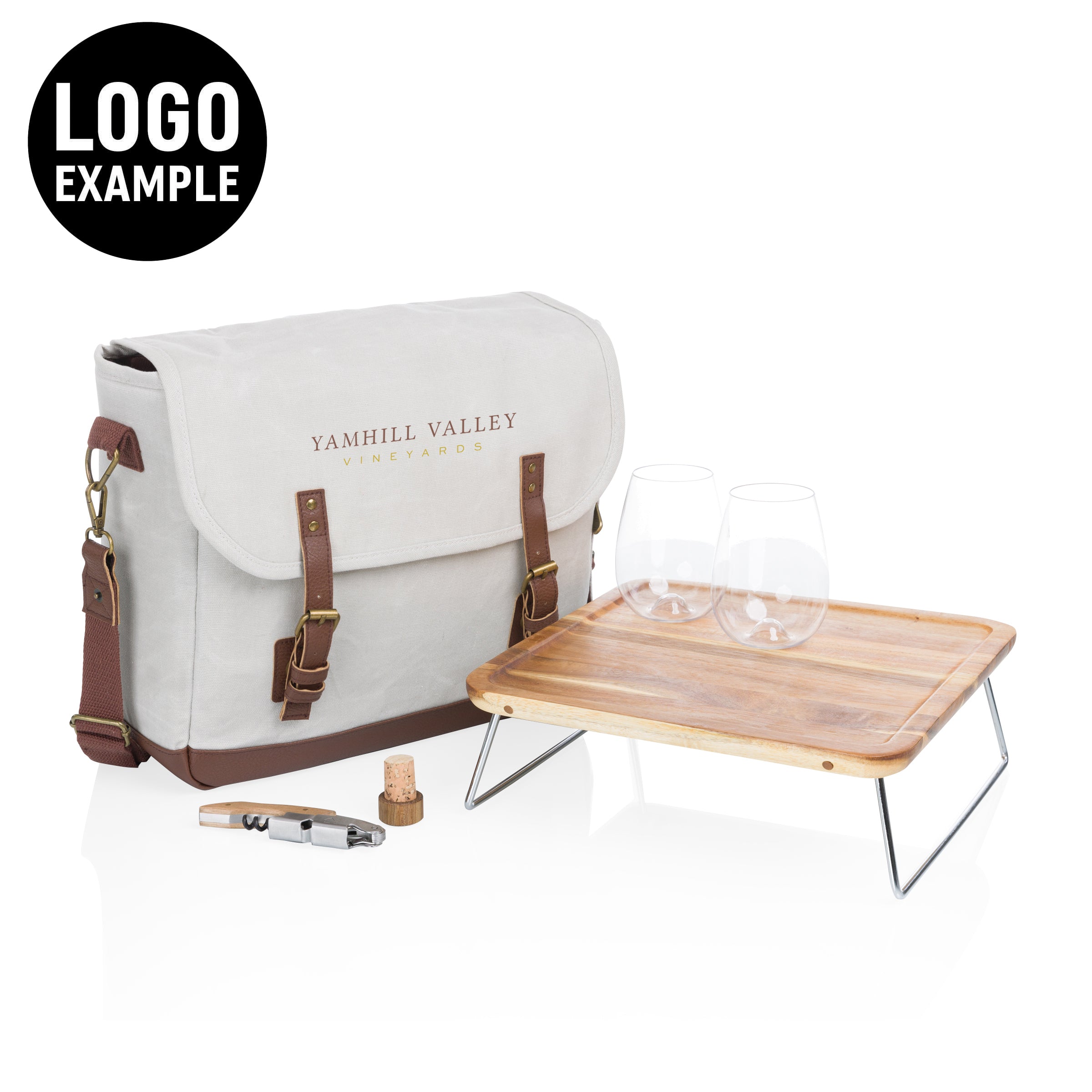 This Adventure Wine Tote - Distressed Waxed Canvas Wine Picnic Bag with Wine Glasses and Mini Picnic Table is a neat little bag. It has everything you would need to enjoy a glass of wine with a friend in the park. High quality bag that holds 2 bottles of wine and comes with 2 plastic wine glasses, a wine opener and stopper, as well as a cheese board or tray. Just wish maybe there was alittle more space to pack a few snacks.