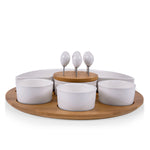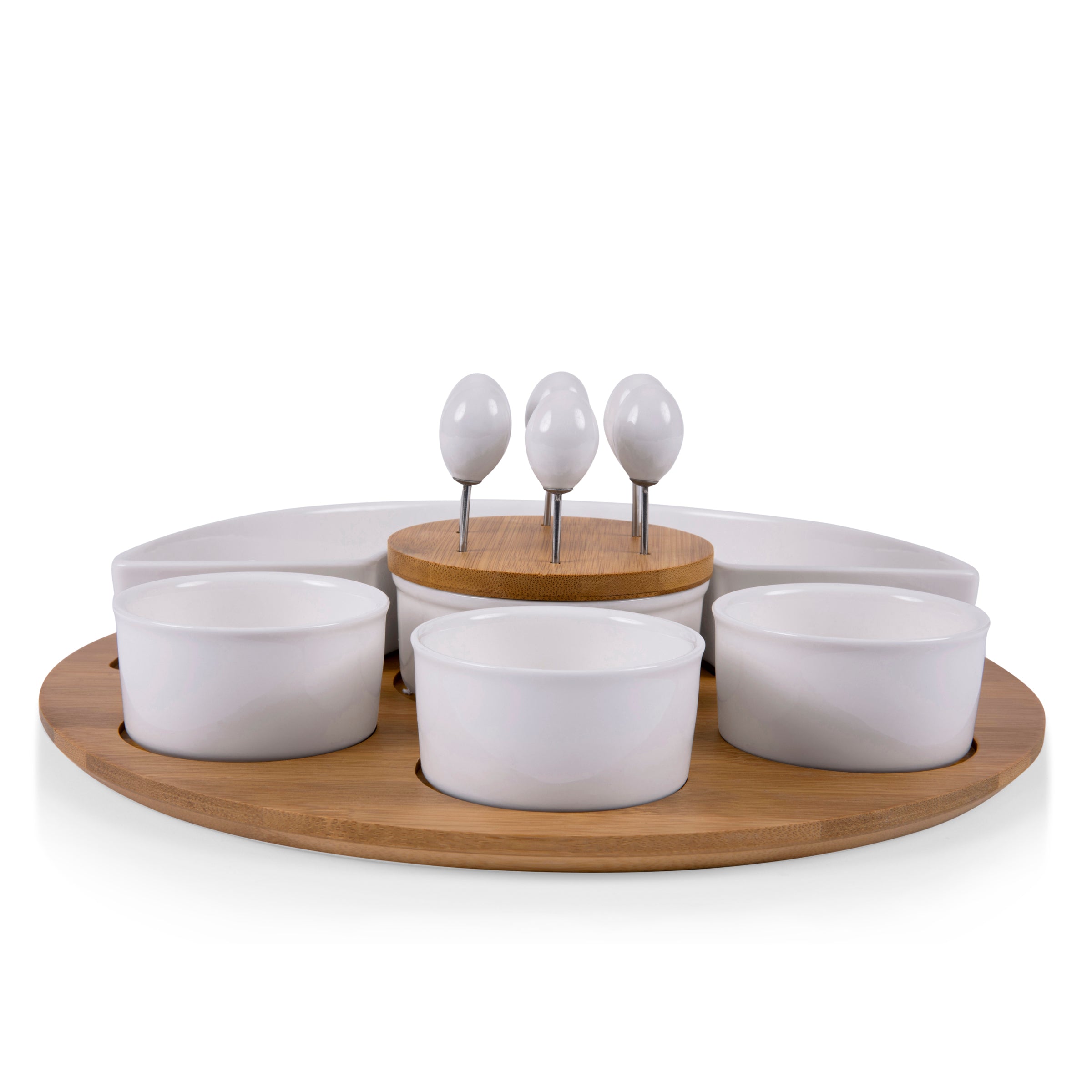 The Symphony Appetizer Serving Tray Set can help make any dinner party sing! This wood appetizer plate features a C-shaped tray, four ceramic dip bowls, and six steel cocktail picks that all fit into the top of the tray. It's a party platter set that keeps your cheese & charcuterie chic & secure.